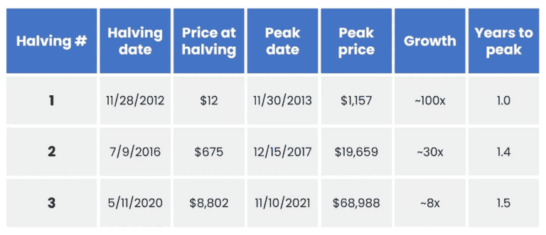 以下是截至目前的三次比特幣減半後,從減半日期到價格峰值的表現: